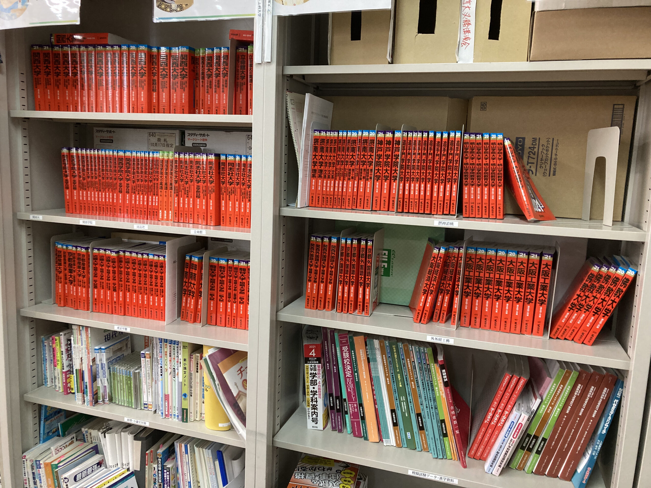 関関同立、産近甲龍、外外経工佛といった関西有名私大はもちろん、近畿圏の国公立大や共通テスト対策問題集、先輩たちが多く進学した私大の赤本も置いてあります。