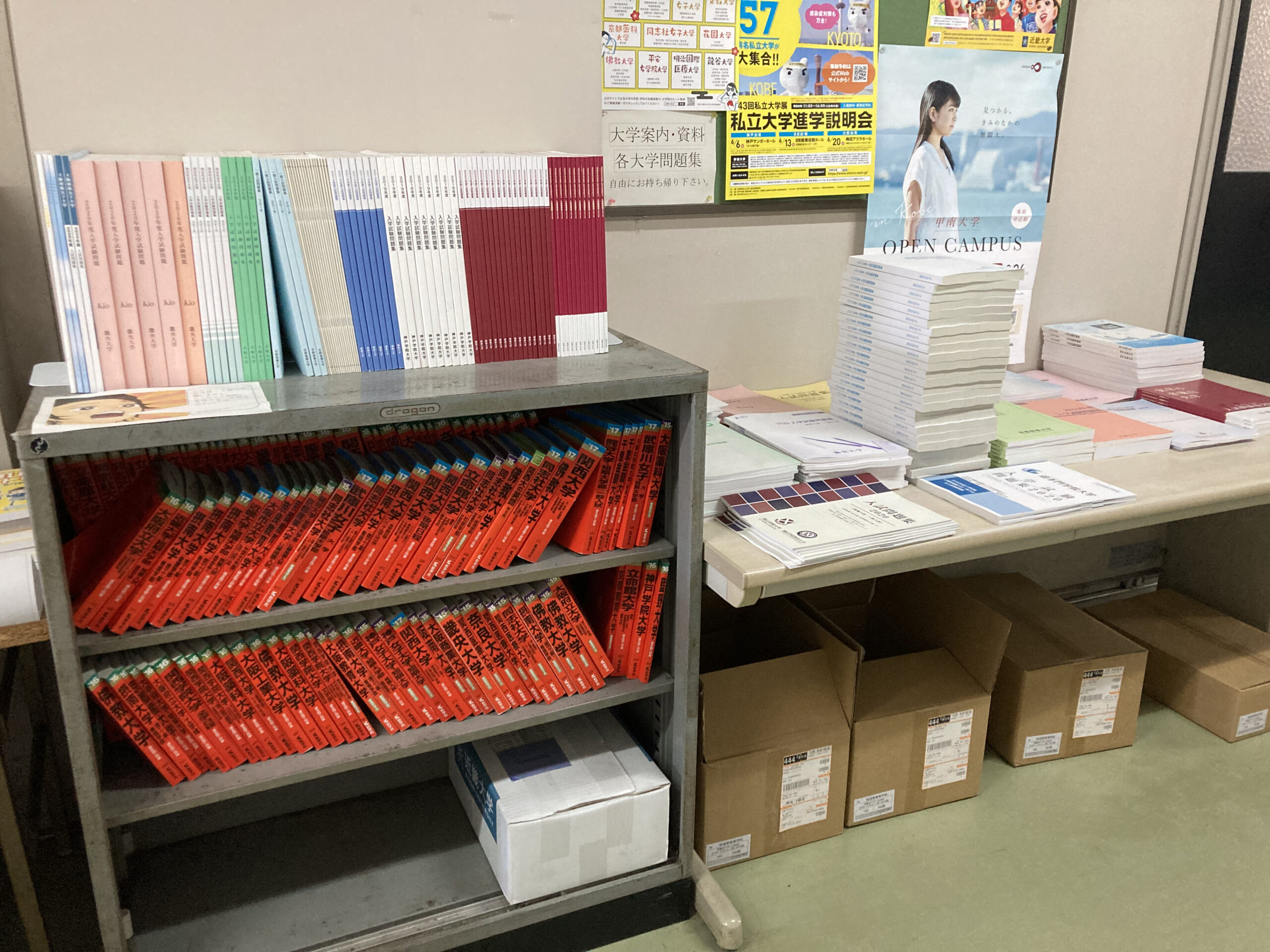 また、進路指導室前の廊下に置いてある赤本や問題集は、持ち帰り可能なものですので、返却の必要もありません。いつでも持って帰ってください。