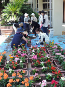 ・一昨年度より同窓会の「阿倍高を美しくする会」の方々と共に、年2回校内ガーデニングを実施。同窓会の方やPTAOBの方との交流を図りつつ、校内美化に取り組んでいます。