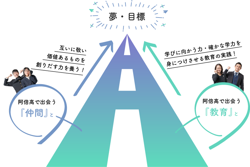 図は阿倍高のイニシャル「A」をモチーフに阿倍高の教育プランを表現しています(校章にある「高梯子」から連想した「一年ずつ確実に登っていけるハシゴ」、「前へ進む矢印」、「夢や目標に向かって飛び立つ紙飛行機」などもイメージしています。色合いは笹竜胆の花と葉です。どこまでも高いハルカスを下から見上げた感じもちょっとあります)。一年次は幅広い知識を学び、自己理解を深め、二年次には多くの体験を通じて進路・目標を見つけます。そして三年次、ともに学んだ仲間、私たち教師陣とともにその具体的な夢、目標の実現に向かいます。そして結果だけではなく「価値あるものを創りだす力」「学びに向かう力」の育成にこだわり、今後の人生の基礎となる力の習得を目指します。