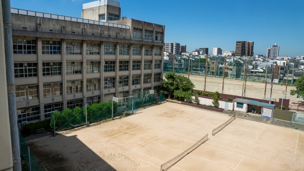 正門の道を挟んで向かい側にある大きいグラウンドです。あべのハルカスがきれいに見えます。