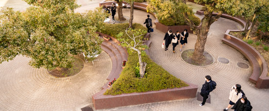 天気のいい日には生徒が中庭に集います。友人と昼休みには昼食をともにし、放課後には談笑するなど、生徒たちの憩いの場のひとつとなっています。木々や花壇なども彩りにあふれており、木漏れ日のもとで友好を深めることは、一生の良い思い出になるでしょう。
