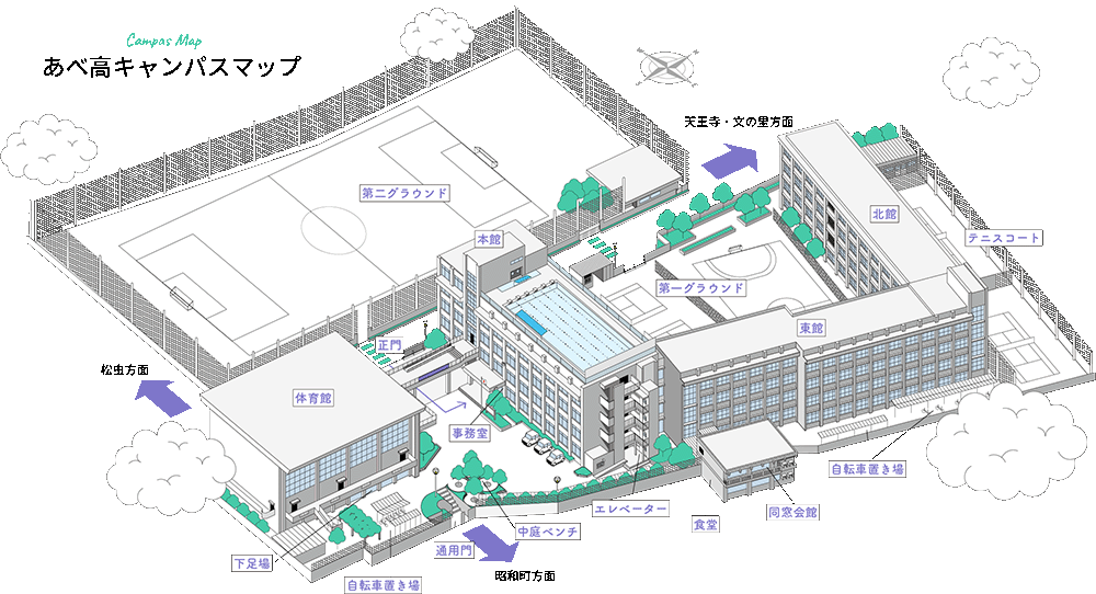 阿倍高は学習環境をよりよくするため施設の充実、美化に努めています。駅から近い住宅地の中にあり、地域の皆さまと共に、多くの卒業生を見守ってきた伝統の校舎です。