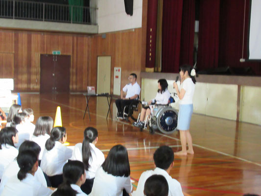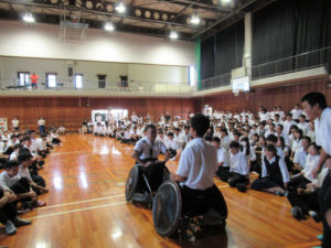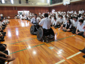 1.2年生は三阪洋行氏の講演でした。車椅子ラグビー(ウィルチェアラグビー)日本代表のコーチをされています。高校時代のラグビー練習で負傷し頸椎損傷によって車椅子生活を強いられて絶望感のどん底から、車椅子ラグビーとの出会いによって夢を持ち、あきらめず挑戦し続けた人生を語ってくれました。代表の生徒を乗せた競技用の車椅子同士の激しいタックル(激突)は会場を騒然とさせましたが、それ以上に「どうすればできるかを考えること」「違うことは個性であること」「自分の価値を高めていくこと」の大切さを語ったお話は心を熱くしていただきました。生徒たちには響くものがあったのでしょうか、聞く表情はとても真剣でした。最後は70期生の北村さんも3年前の講演に勇気をつけられて頑張り、現在大学で成績優秀により表彰されるに至ったことのお礼を言うために駆けつけてくれました。手紙の代読と本人のお礼の言葉は力強く、とても感動的なシーンとなり三阪さんも大喜びでした。