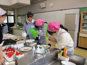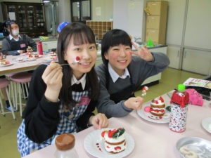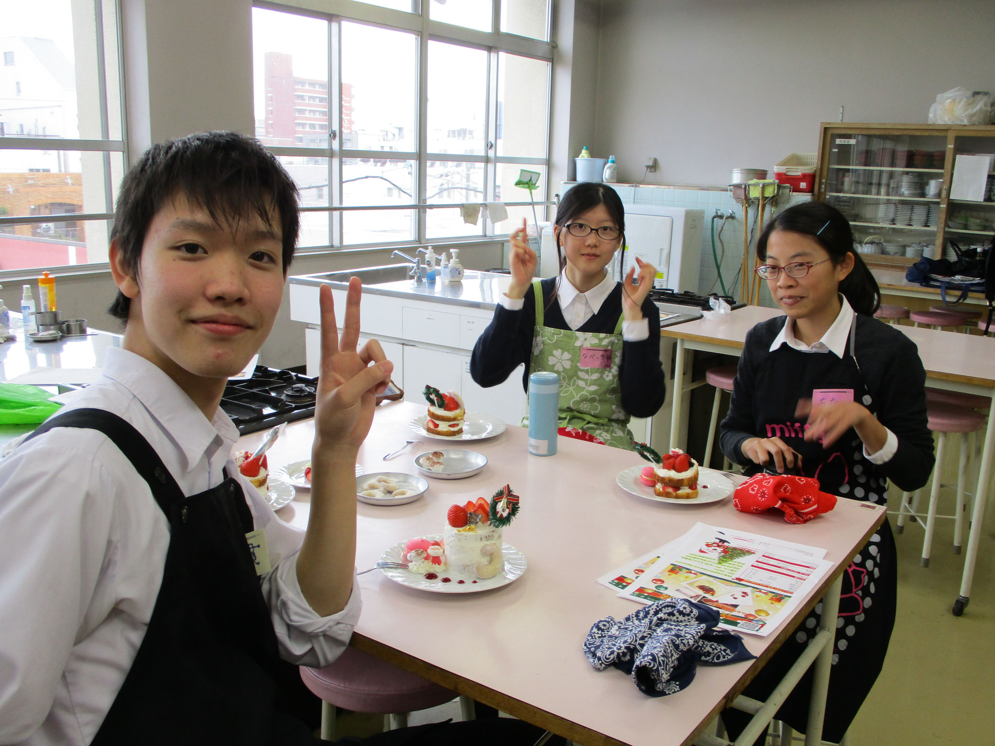 2018.12.10 冬のお菓子作り講習 専門学校の先生による指導 地域連携 毎年恒例の家庭科部の「お菓子作り講習会」今回はクリスマスにちなんだイチゴのショートケーキです。1年生から3年生まで参加して、わきあいあいと楽しく作りました。