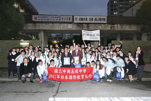 校門で集合写真を撮影し、17時半頃、バスで心斎橋に向かう中興の高校生を見送りました。夕闇の中お土産を手渡し、スマホで写真を取り合いLINEのアカウントを交換し合う日台の高校生。東アジアで今を生きる高校生たちの未来につながる大切なものを、この一期一会がもたらしてくれたことと思います。