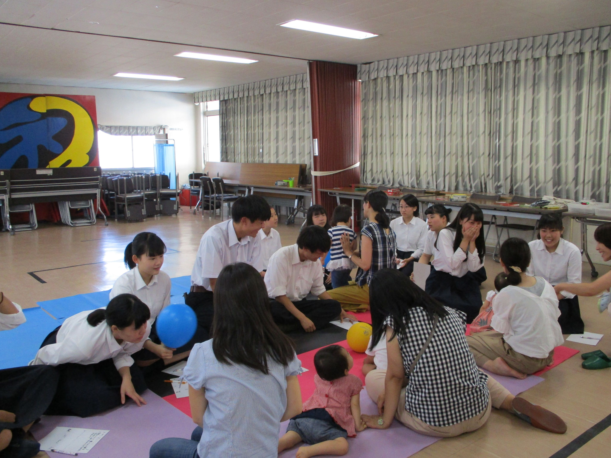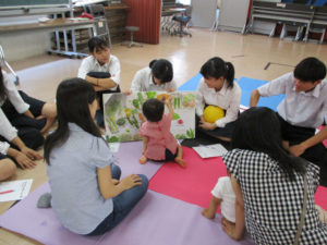 2018.07.19 地域の親子が来てくださいました。 地域連携 0719Thu 2歳以下のお子さんをお持ちの4組のお母さん方が、阿倍野高校に来てくださいました。「子どもの発達と保育」の授業で、自分たちの作ったおもちゃや絵本を持っていき遊びました。またお母さん方に子育てや保育に関するインタビューを行いました。育児の大変さや楽しさを直接聞くことが出来ました。小さい子どもと接することは、とてもよい経験になりました。