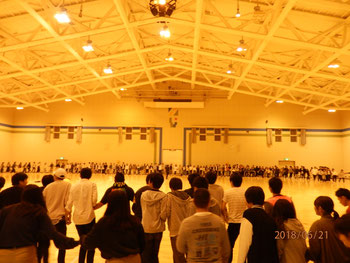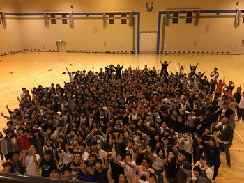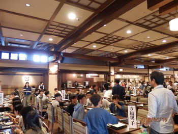夕食の後は、全体レク。雷雨のため、レク会場までの移動ができず、開始時間が大幅にずれてしまいました。そのため、レクの予定を少し変更して行いましたが、そんなことは関係なく大盛り上がりでした。