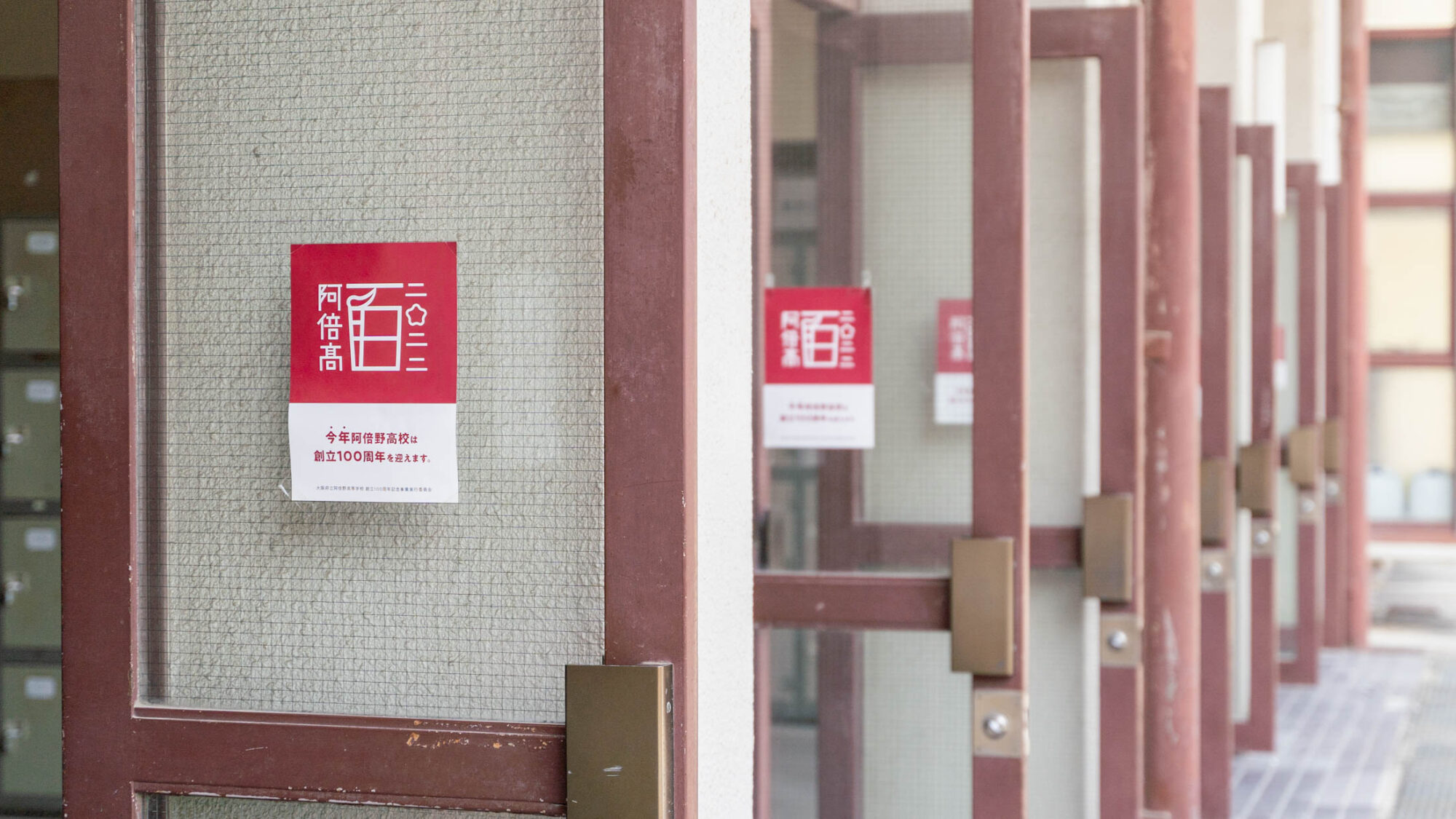 2019.08.26 100周年を知らせる横断幕が完成しました。 あべ高100周年 0826Mon 大阪府立阿倍野高等学校 創立100周年記念事業実行委員会が作成した「100周年を知らせる横断幕」が完成しました。体育館と本館をつなぐ通路の校舎側に掲示されました。