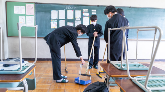 清潔な学習環境は、まず日々の掃除から!!クラスで割り当てられた場所の掃除をします。