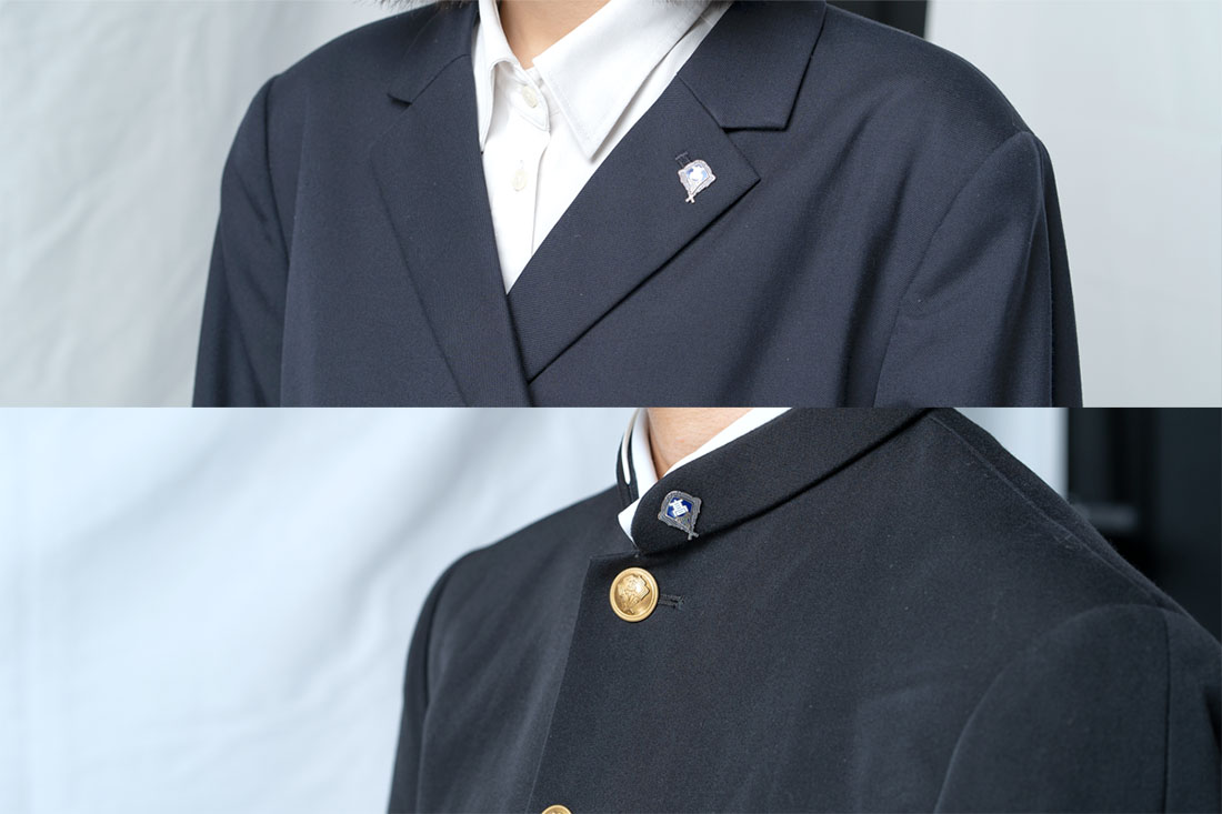 - 男子生徒黒の標準型の学制服とし、本校のボタンと校章をつける。夏は、上着なしで白のワイシャツまたは開襟シャツを着用し、左襟に校章をつける。冬は上着の下を白いワイシャツとする。